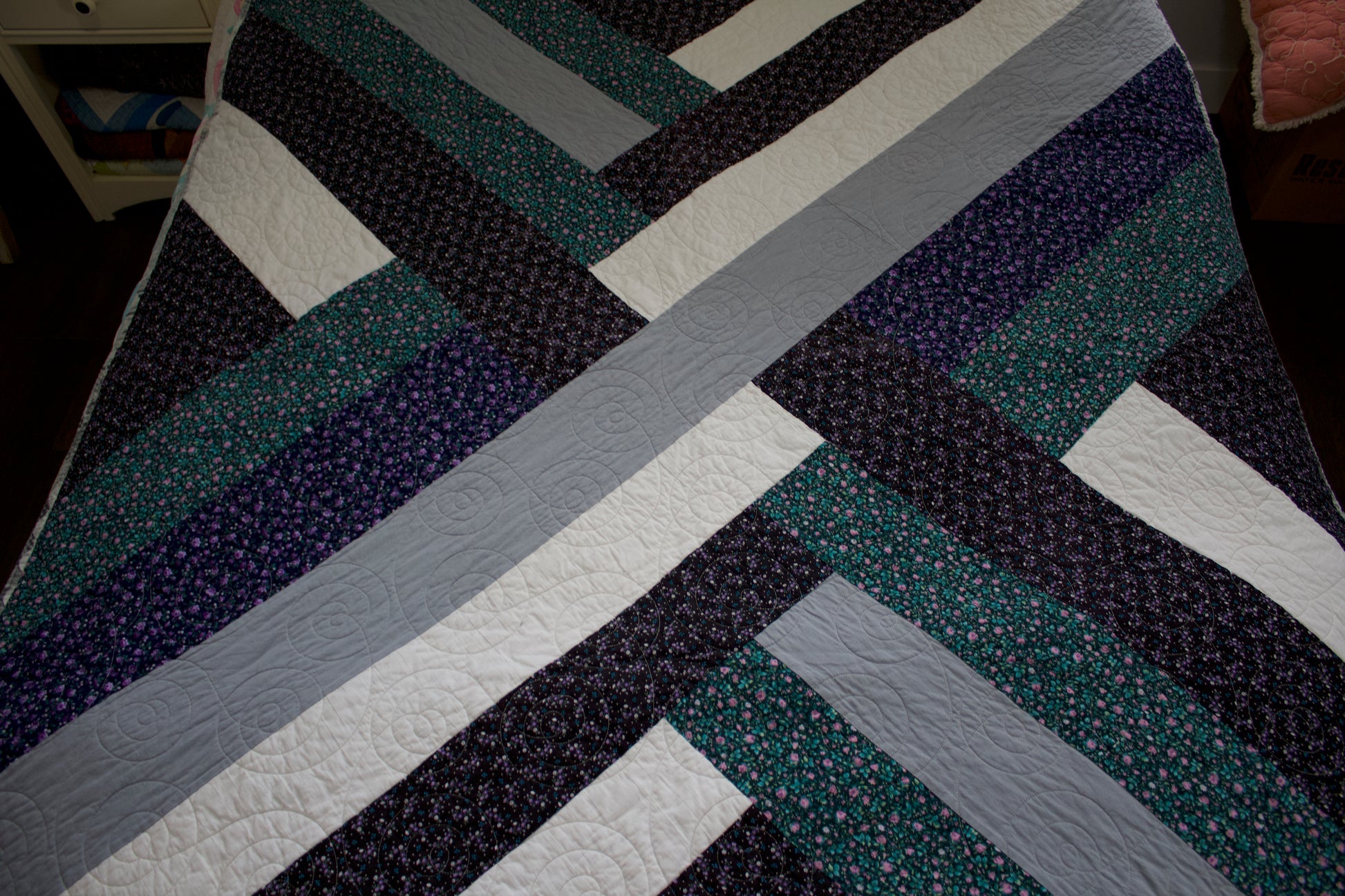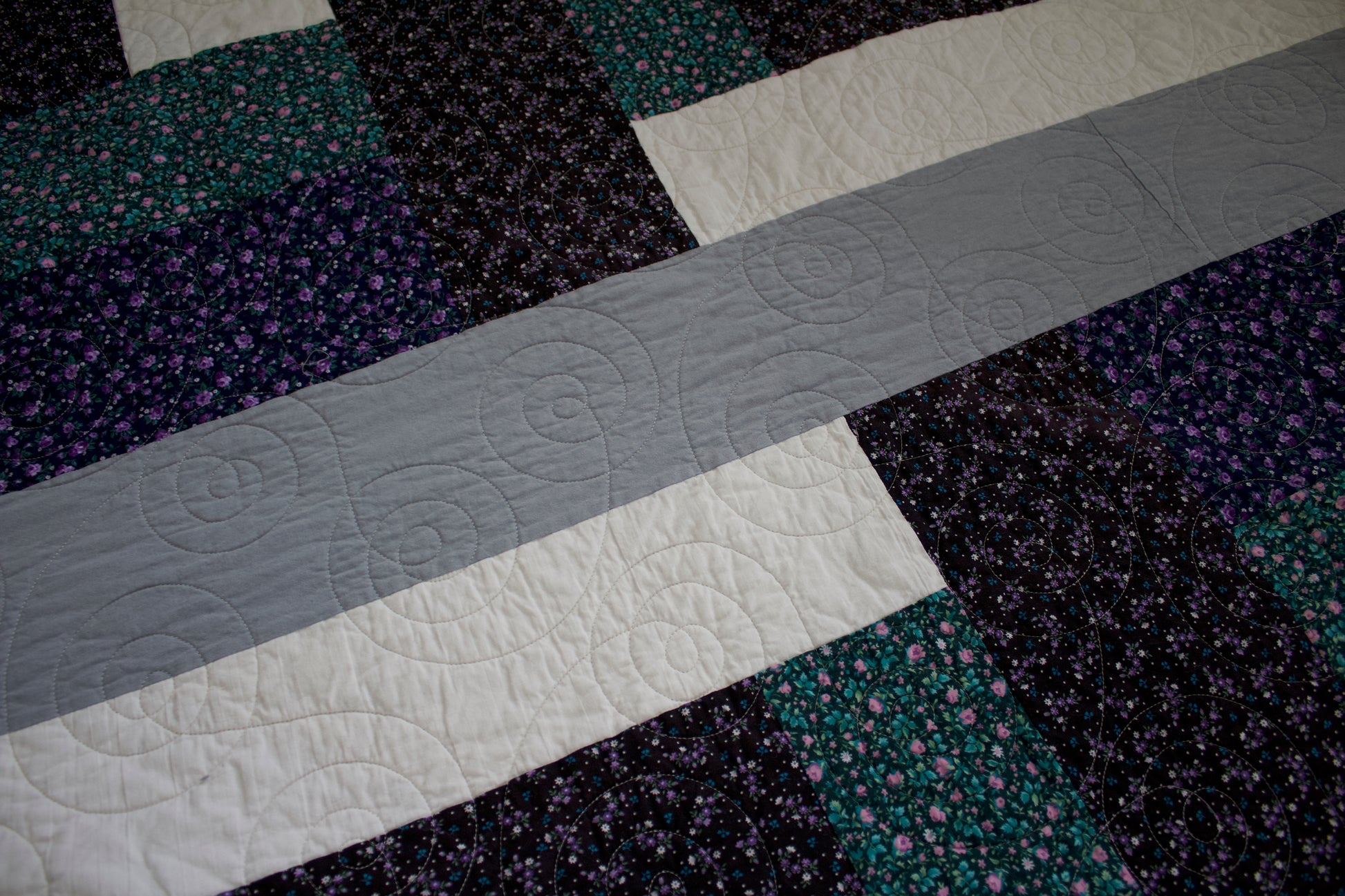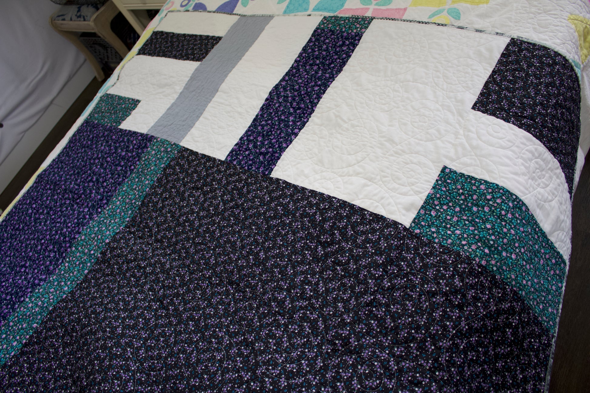 This handmade quilt features a bold and vibrant floral design in striking black, green, purple, and white tones. The rich colors create a perfect contrast, while the floral patterns add a touch of elegance and charm. Crafted with attention to detail, this quilt is not only a beautiful decorative piece but also soft and cozy for everyday use. Whether displayed on your bed or couch, it’s sure to bring a pop of color and warmth to your home. A unique, one-of-a-kind quilt that blends modern style with timeless craftsmanship. It has a scrappy backing.