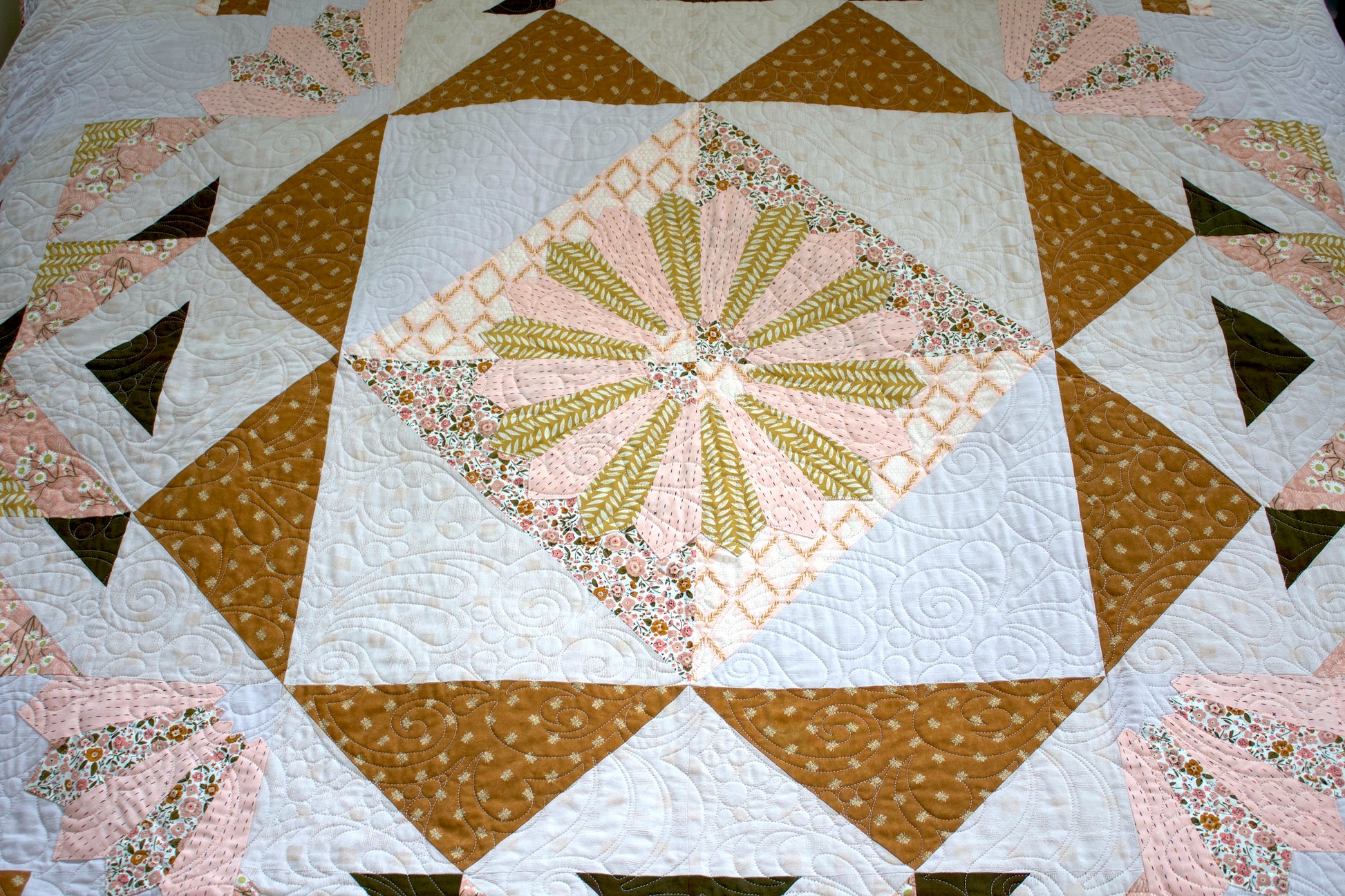 A beautiful quilt with some textured fabrics. Solid floral backing.